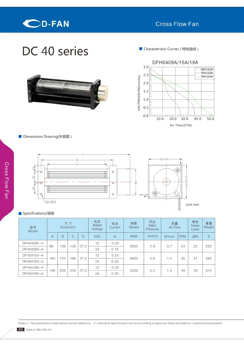 DC FAN横流风扇040参数 DC FAN横流风扇040曲线图 DC FAN横流风扇040外观图